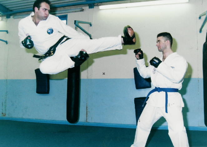 Demonstrating a flying side kick for the Thanet Gazette in 1996 (with Ian Garbett)